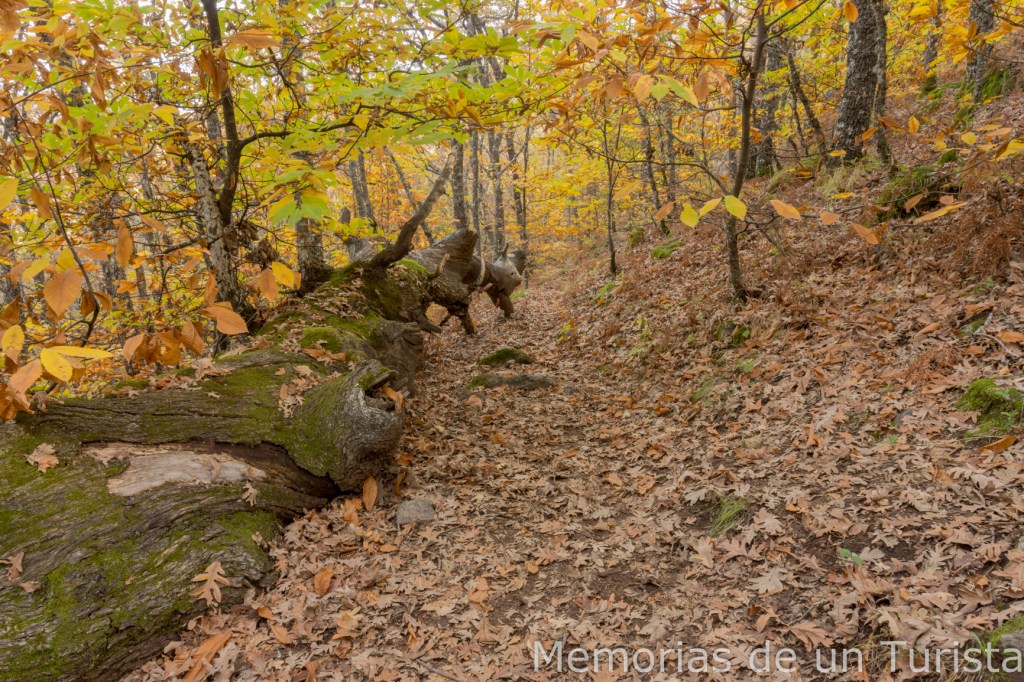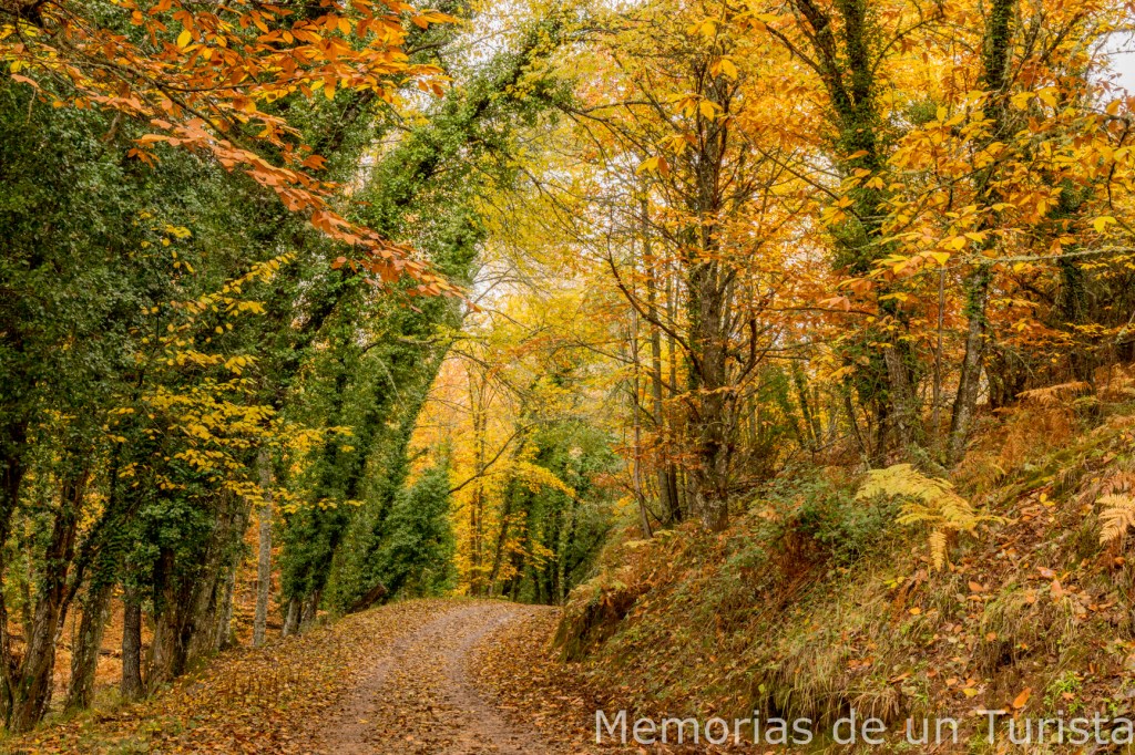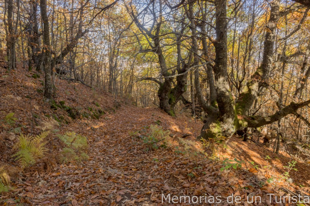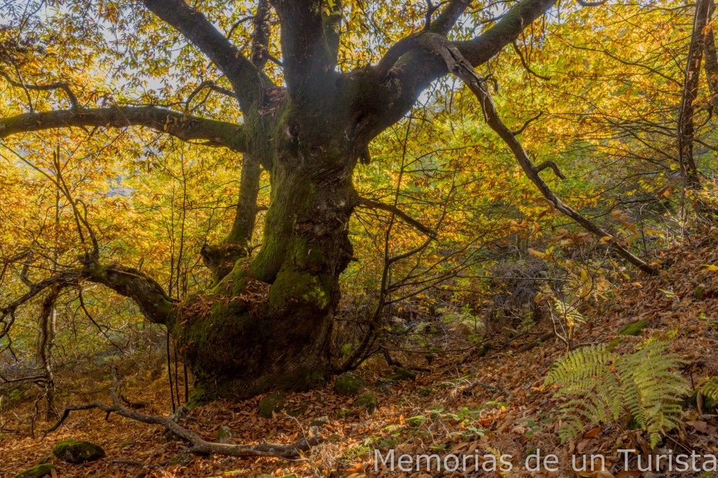 Tomé la decisión de volver al coche para subir por la carretera que lleva hasta La Villuerca. Y no fue mala elección porque por el camino hice algunas paradas para captar tomas preciosas del anterior castañar desde lo lejos. El otoño estaba en el punto ideal de color.