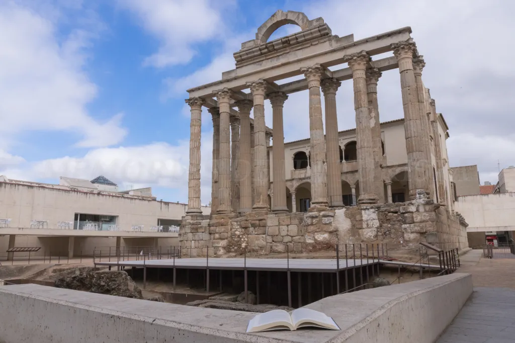 Apenas habré estado aquí diez o quince minutos. Mi idea ahora era ir hasta el que es, desde mi parecer, el monumento emeritense que más impacta cuando lo ves por primera vez. La joya de Mérida es el Teatro Romano y eso es intocable, pero el Templo de Diana causa asombro verlo levantarse entre casitas de pueblo y mostrando toda su belleza. Por la calle, normalmente llena de turistas que paran a fotografiarse ante él, apenas pasaba gente de largo (un par de personas o tres me he encontrado), con lo que me he deleitado bien fotografiándolo. En la siguiente imagen aparece mi novela a sus pies.