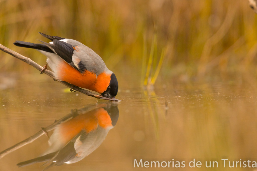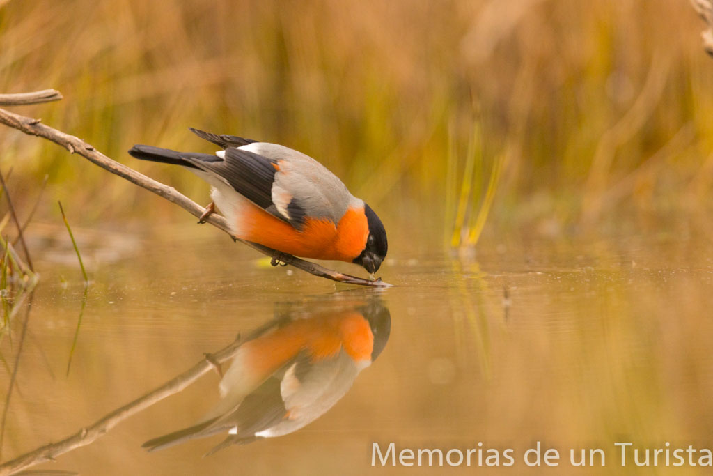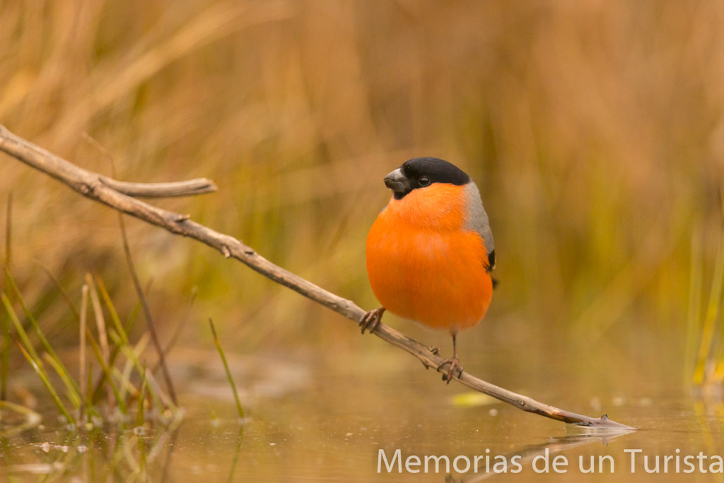 He dejado para lo último al pájaro estrella que me entró al hide. Una vez más, demostré mi auténtico desconocimiento de la especie de la que se trataba en el momento en el que bajó. Según lo vi, dije: ¡qué bonito es! Y me dediqué a hacerle fotos. Bajó tres veces distintas a beber. Cuando llegó Teo de vuelta y me preguntó qué especies habían bajado, empecé a hacerle un listado, pero de esta especie le dije <<me ha bajado también un pájaro grande, de color naranja y con la cabeza negra>>. Sorprendido, me contestó: <<¿no sería un camachuelo?>>. Le enseñé una de las fotos que había hecho y me lo confirmó, diciéndome que hasta ese momento no habían tenido constancia de la presencia de esta especie en el hide durante todo el otoño/invierno (otros años sí ha estado). Así que tuve una suerte tremenda por haberlo tenido delante.