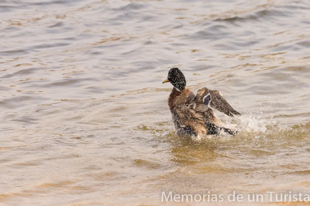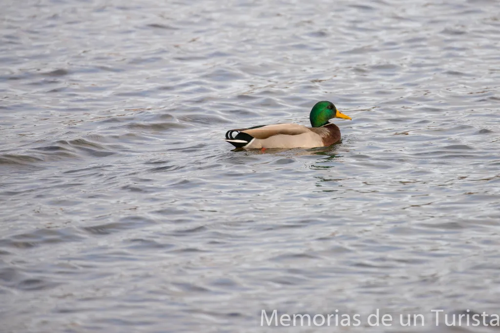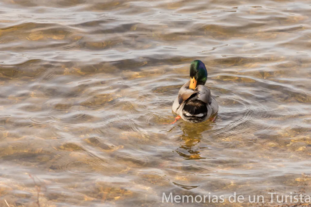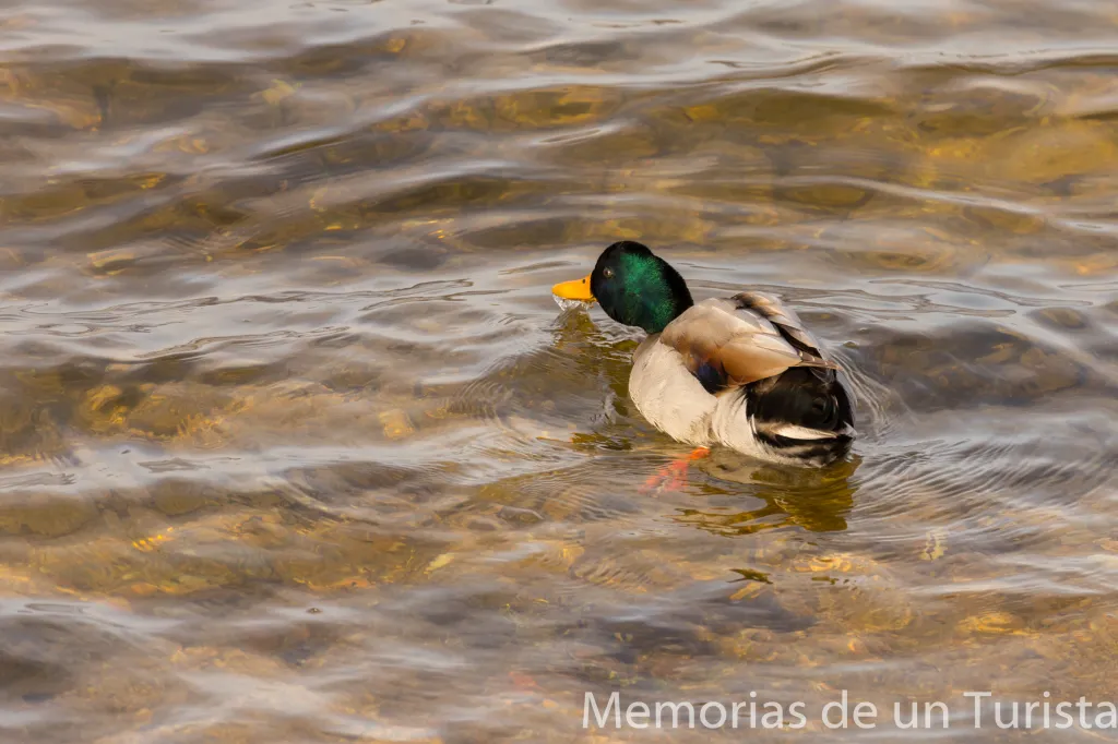 Según me iba acercando a la orilla, los animalitos han echado a nadar, huyendo de mi presencia y dejándome con cara de bobo al pensar que quizás me habían engañado acerca de lo mansos que eran. La solución estaba bien clara. Volver a subir hacia el camino y fotografiarlos desde allí, que al estar algo retirado no se iban a asustar. Esta vez sí ha surtido efecto y los ánades reales se han portado muy bien.