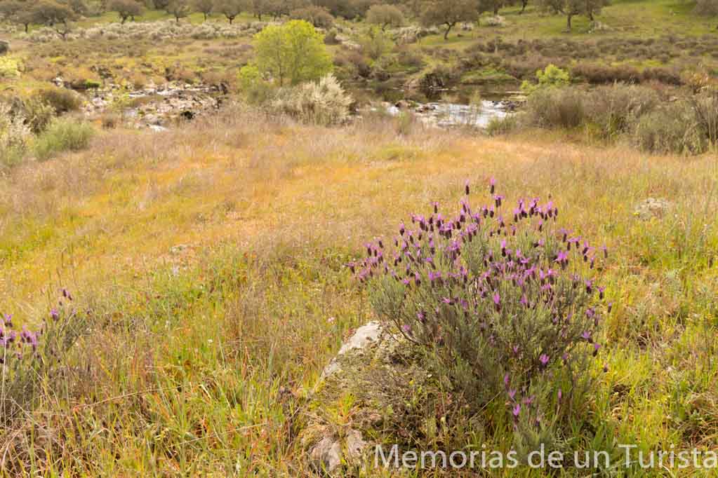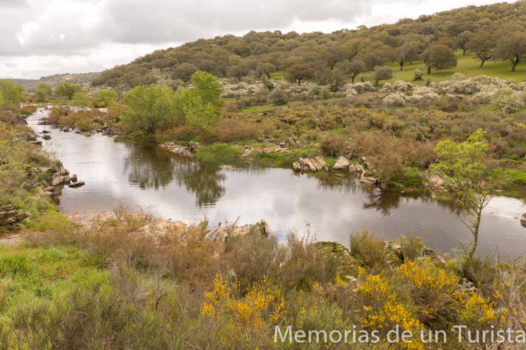 Sobre las 10:10 mis pies se ponían en movimiento desde el puente. Una vez aparcado el coche, hay que cruzar la carretera y bajar por un pequeño camino, como si te fueras a meter debajo del puente. Por este camino, incluso, se puede bajar el coche y dejarlo en una explanada que hay. Antes de bajar, os dejo con una foto tirada desde la carretera. Por ahí es por donde he venido, es decir, esa carretera lleva hasta Trujillo/Cáceres.