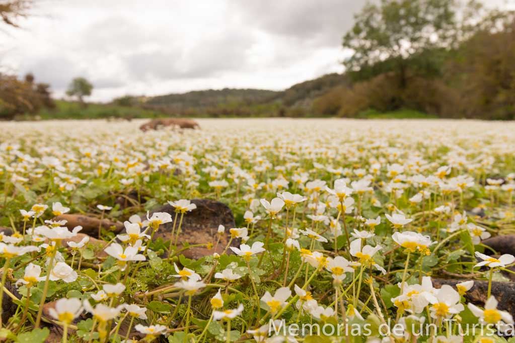 ¡Esperad! ¿Qué es una salida fotográfica sin que me revuelque por el suelo? Casi llegando al puente, el agua está cubierto de flores blancas de los ranúnculos.