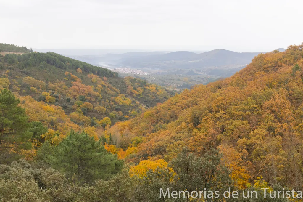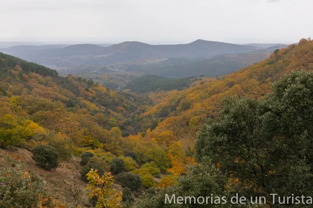 De vuelta en el coche decidí subir por la carretera que lleva hasta lo alto de La Villuerca. Pero no llegué hasta arriba del todo. Aparqué en un apartadero por el que he pasado decenas de veces y me fijé en una señalización hacia el Mirador del Viejas. Como nunca había estado en él me picó la curiosidad y decidí ir, pues se encuentra a escasos 300 metros. Al llegar, pude ver unas preciosas vistas.