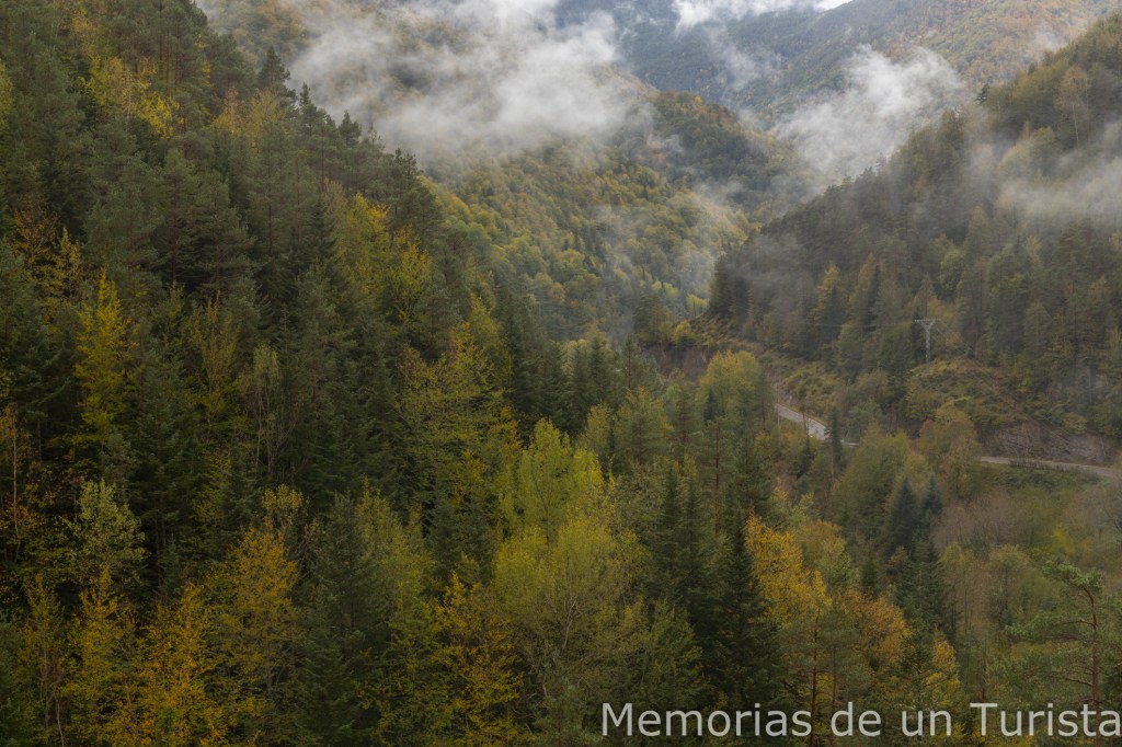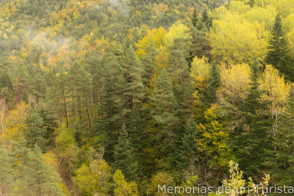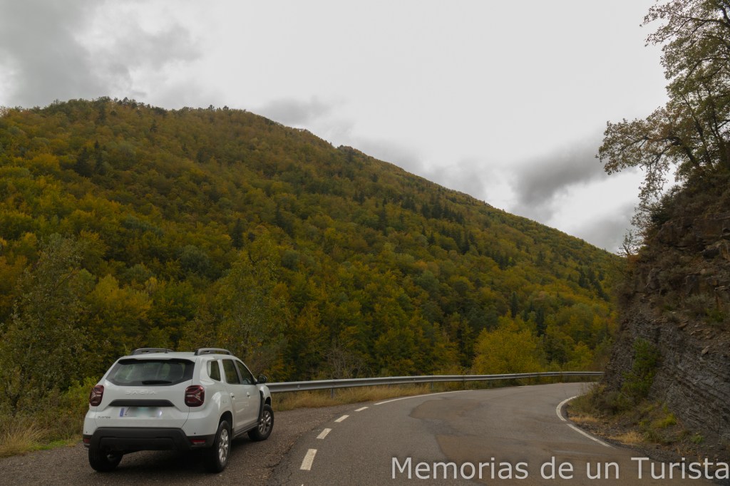 Nada más desayunar, cogí el coche y me acerqué hasta mi bosque favorito de todos los que he visitado en España: el Bosque de la Pardina del Señor. Aquí hice las fotos más bonitas y espectaculares dos años atrás y quería ver cómo se encontraba en esos momentos. Nada más llegar a sus inmediaciones supe que esta vez no iba a ser tan bello como en 2021, pues el largo verano que hemos tenido también ha afectado al Pirineo Aragonés y estaba todo aún muy verde. No obstante, a pesar de la lluvia que caía en esos momentos, disfruté del momento.