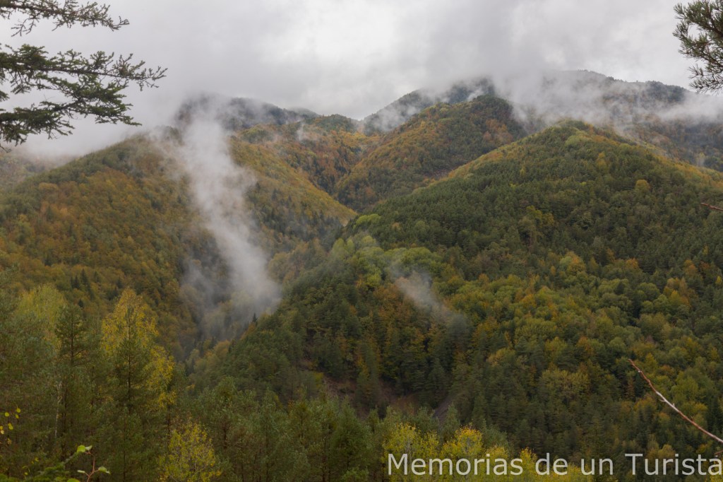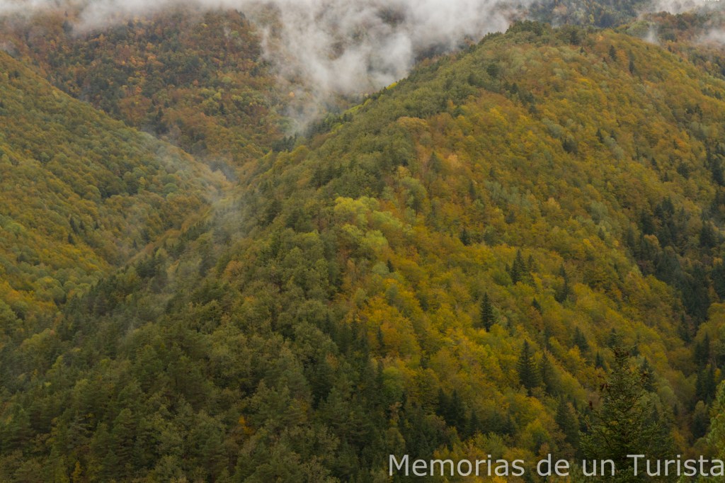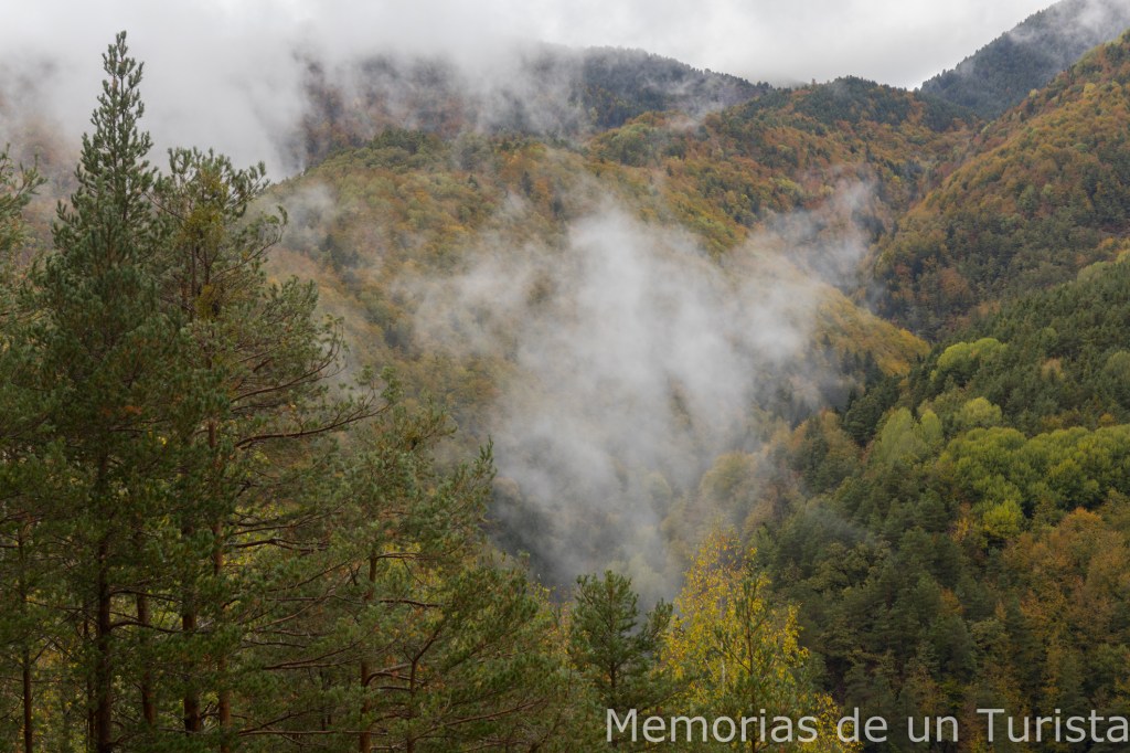 Pasada la anécdota y los agobios del principio, volví de nuevo hacia Torla. Tres días después, el lunes, también caía agua a cántaros y decidí acercarme de nuevo a este bosque para ver la evolución del otoño. Aunque no había avanzado mucho, sí se notaban los árboles más amarillos.